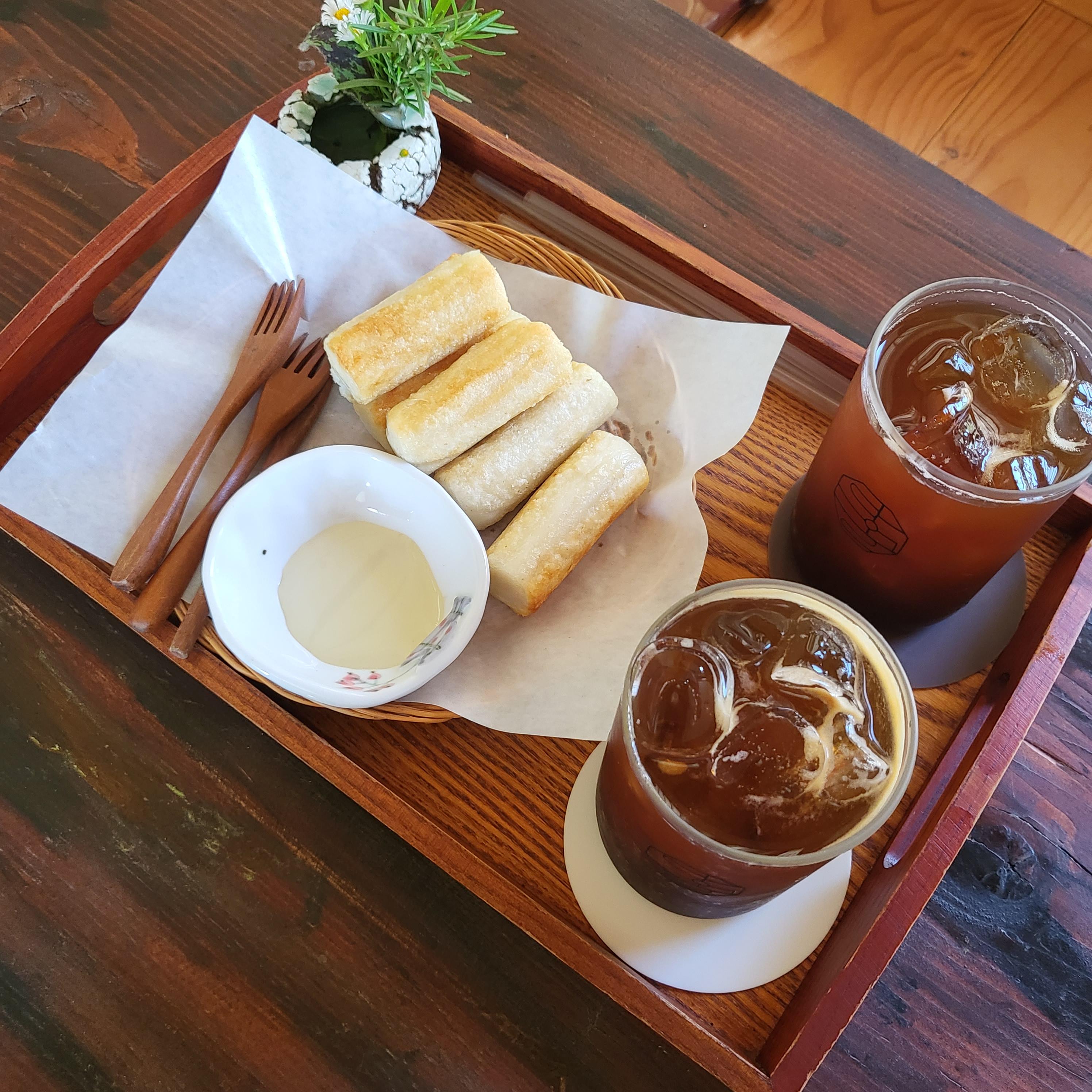 짠!! 주문했던 아이스 아메리카노와 가래떡구이입니다 🧡