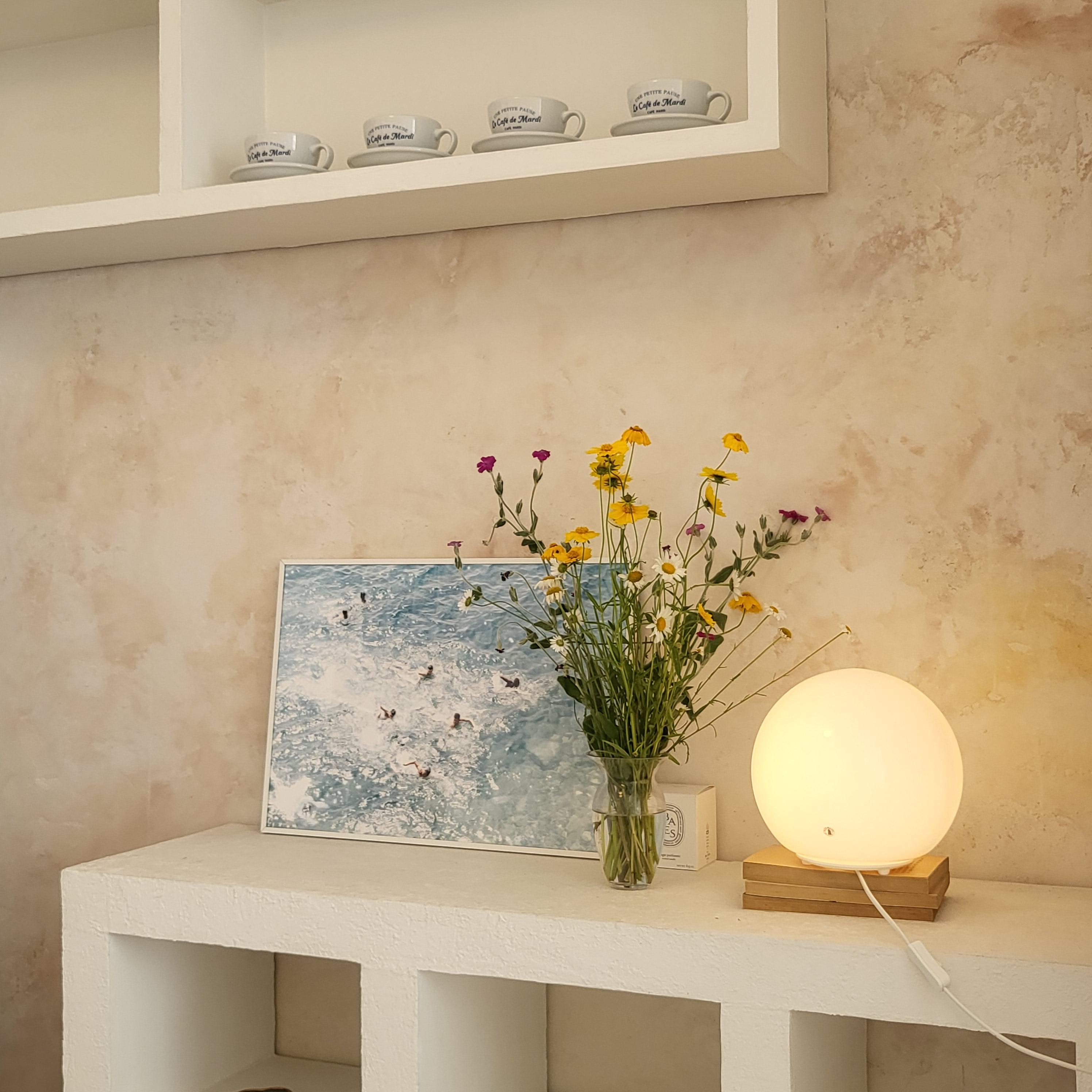 유럽풍 감성 카페답게 벽지 색감, 질갑, 인테리어 소품이 따뜻하고 아늑한 느낌이 납니다